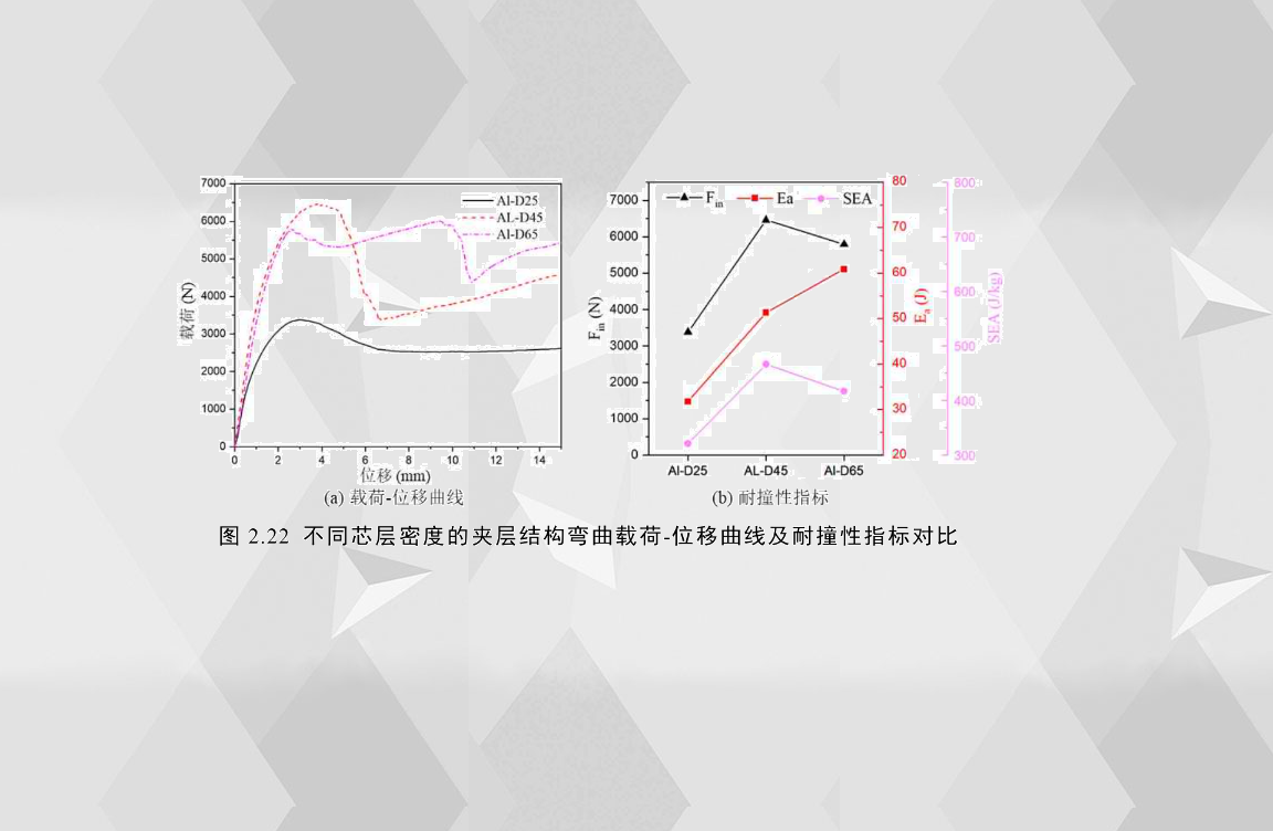 對不同芯層密度的鋁合金夾層結構而言,其載荷-位移曲線和壓潰過程差別較大,如圖2.22(a)所示,芯層密度為0.25g/cm3的AL-D25和芯層密度為0.45g/cm3的AL-D45的載荷-位移曲線屬于類型I,芯層密度為0.65g/cm3的AL-D65的屬于類型Ⅱ,AL-D25的臨界失效模式為芯層剪切(CS),臨界載荷最小,由于其芯層密度較低,其后期主要失效形式還是以剪切裂紋為主,后屈曲壓潰力與臨界失效載荷相比相差不大。AL-D45的臨界失效模式也為芯層剪切(CS),其臨界載荷是三者中最大的,在臨界失效之后小段位移耦合了下界面失效,其載荷下降很快,嚴重降低了試件吸能。值得注意的是,雖然AL-D65的芯層密度比AL-D45的大,芯層可以承受的剪切強度大,但AL-D65的芯層的平均胞元大小比AL-D45的小,界面的強度比AL-D45的小,而在加載過程AL-D65的界面能承受的剪切強度比芯層能承受的剪切強度小,所以發(fā)生了界面分離的臨界失效模式,使得AL-D65的臨界載荷反而比后者的小。雖然AL-D65在彎曲位移2.5mm左右處發(fā)生界面失效,但其失效界面的位置為上膠層,位移相對較小,試件整體的承載能力還很強,所以其載荷下降的幅度比例相對AL-H10更小,所以前者的吸能效果更佳。