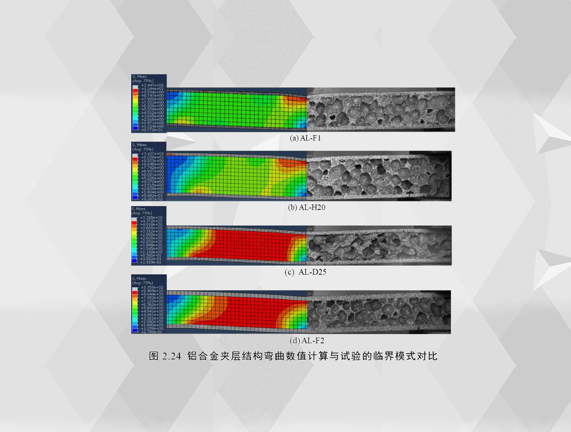 圖2.24為計算所得的泡沫鋁夾層結(jié)構(gòu)在彎曲位移約為3mm時的變形模式云圖與試驗所得的臨界失效模式圖對比。從各圖變形對比可以看出,數(shù)值模擬得到的失效模式和試驗的臨界失效模式基本一致,AL-F1和AL-H20為壓痕壓入(IN),AL-D25和AL-F2 為芯層剪切(CS)。