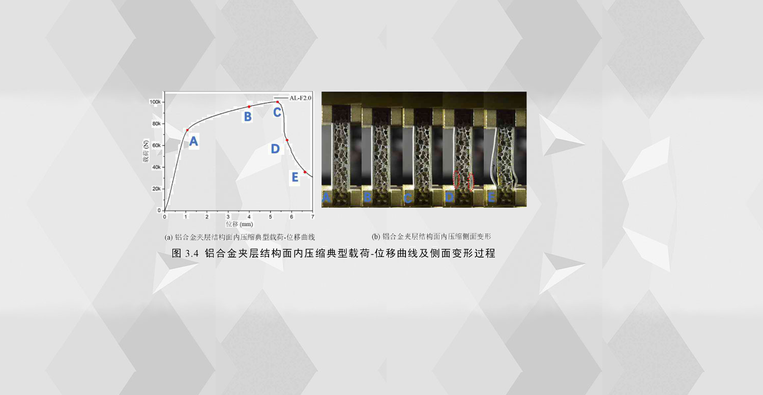 圖3.4(a)描繪了鋁合金夾層結(jié)構(gòu)在面內(nèi)壓縮下典型載荷-位移曲線,其壓潰過程大體可以分為三個(gè)階段,O-A彈性階段,此階段結(jié)構(gòu)處于彈性變形,載荷與位移的關(guān)系為線性增長;A-C塑性階段,在此階段結(jié)構(gòu)面板受到較大的壓力而產(chǎn)生塑性變形,載荷與位移仍近似呈線性增長趨勢,只是載荷增長幅度遠(yuǎn)小于彈性階段增長幅度;C之后屬于后屈曲階段,由于在此階段面板發(fā)生嚴(yán)重屈曲變形,并且面板與芯層之間的膠層出現(xiàn)大面積失效,這導(dǎo)致夾層結(jié)構(gòu)的承載能力大大降低,此外,由于泡沫芯層壓縮的效果,在面板失穩(wěn)之后夾層結(jié)構(gòu)仍有較弱的承載能力,并未完全失去承載能力,圖3.4(b)為此試件在圖3.4(a)各點(diǎn)時(shí)刻側(cè)面面板與芯層泡沫的變形圖。